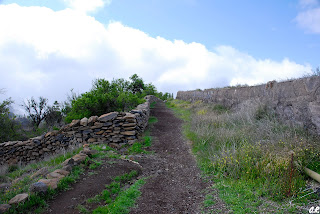 Empezamos a ascender por el camino que discurre entre muros de piedras y con un suelo muy irregular. Tres chicas alemanas que salían delante de mi se pierden de mi vista, llevan un ritmo de “Molinillo”. Mientras, yo me entretenía haciendo unas fotos y cogiendo aire porque el principio del sendero con sus rocas incrustadas en el suelo y los cambios de ritmo que me veía obligado hacer me habían pegado una pequeña fundida. Unos perros de presa canarios me pasan, me huelen, me miran y se me meten entre los pies y estoy a punto de “cagarme todo”. (“¡Chaaaaaa vengan pa caaaa!”). (“Tranquilo que no hacen nada, estos perros están tontos”). “Tontos una miiiierda”. Los perros se perdieron por el sendero junto con sus amos, mientras yo seguía allí parado con flojera de patas y sudor frío. Continuo el sendero recto, sin desviarme hasta llegar a una casa con huertas a la izquierda del sendero (Casa Galindo). Aunque hay una bruma que cubre el Sombrerito de Chasna, (2.400 metros) se me antoja que es una vista espectacular. (Fotos) Hay bastantes almendros por el lado derecho del sendero